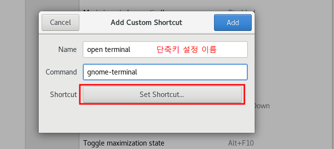 Ctrl + Alt + t 를 터미널 창 열때 주로 사용하더라구요. 그럼 설정해보겠습니다.