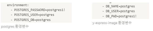 my-express-image: ... environment: - PORT=8010 - DB_HOST=my-postgres - network 요소를 생성하여 db와 server를 하나의 network로 묶어준다.